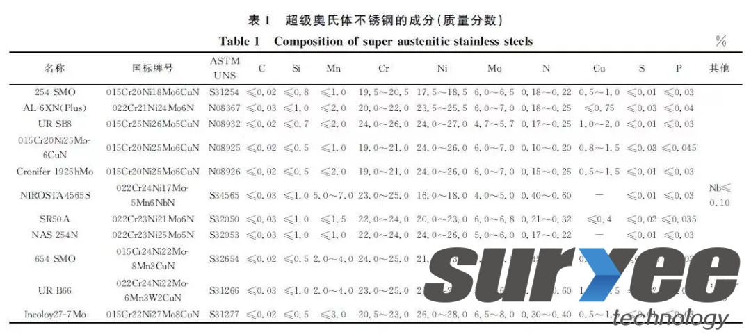 歷經3個階段的發展,超級奧氏體不銹鋼逐漸成熟與完善,目前超級奧氏體不銹鋼共有11種,成分如下表所示: