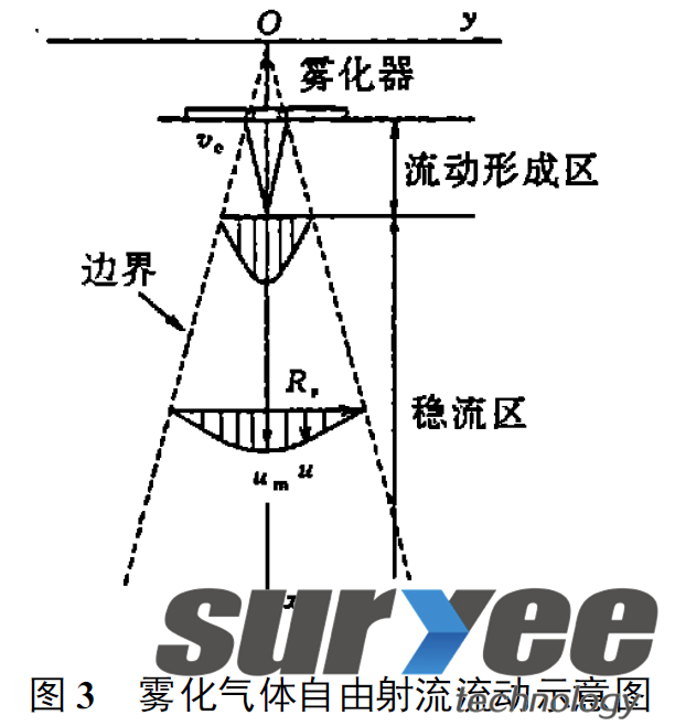 噴射成形所用噴嘴形成的氣流一般是軸對稱的。圖3給出了軸對稱自由射流流動示意圖,圖中O點為射流源極點,um為射流某一截面的軸向速度,u為該截面上任意一點的縱向速度,Rs為該截面的射流半徑。