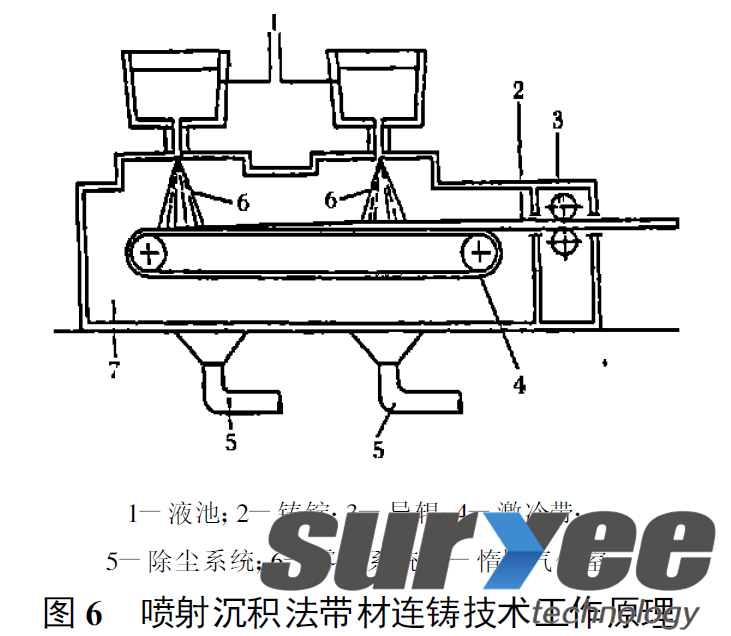 噴射沉積法帶材連鑄技術的工作原理如圖6所示。仍以激冷帶為基礎,但合金液不是采用連續澆注的方法,而是通過噴射,沉積在激冷帶上,在激冷帶的激冷作用下發生凝固與冷卻。通過激冷帶的運動,連續將鑄錠從一側送出。在該過程中,鑄錠的上表面是完全開放的自由表面。熱量只能通過下部的激冷帶導出。雖然導熱速率將小于雙側激冷連續鑄造過程,但由于合金液是通過霧化后噴射在激冷帶上的,仍可能獲得很大的冷卻速率。