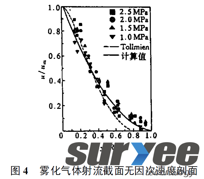 圖4給出了霧化噴嘴(軸對稱射流)霧化氣體無因次縱向速度(u/um)與無因次半徑(y/Rs)之間的關系。可以看出實驗值與理論值在霧化錐軸線附近相符較好,在邊界層附近略微有點誤差。為了進一步討論與計算的方便,根據實驗數據,并結合理論計算結果,在一定精度范圍內可采用下面的近似關系式: